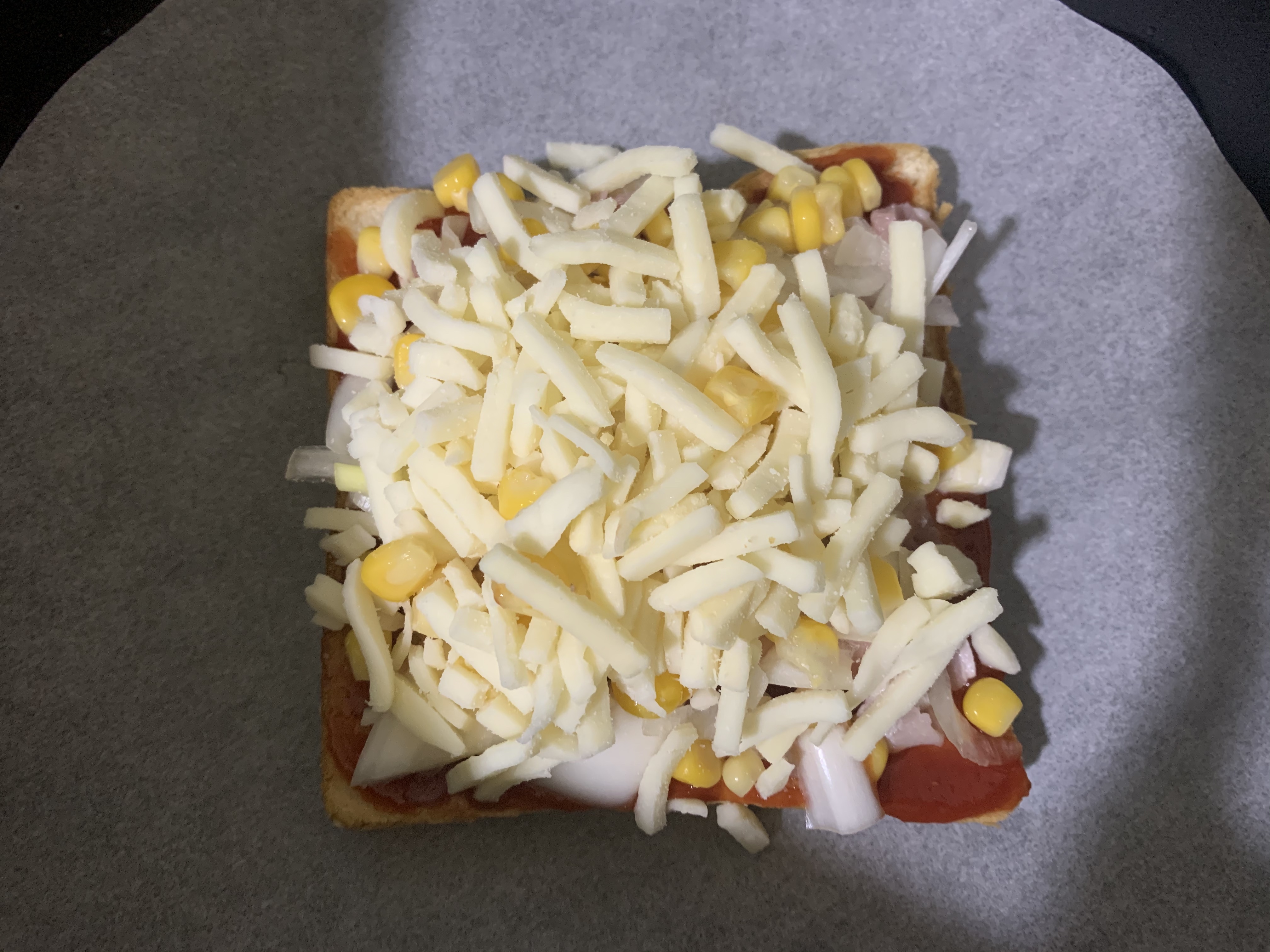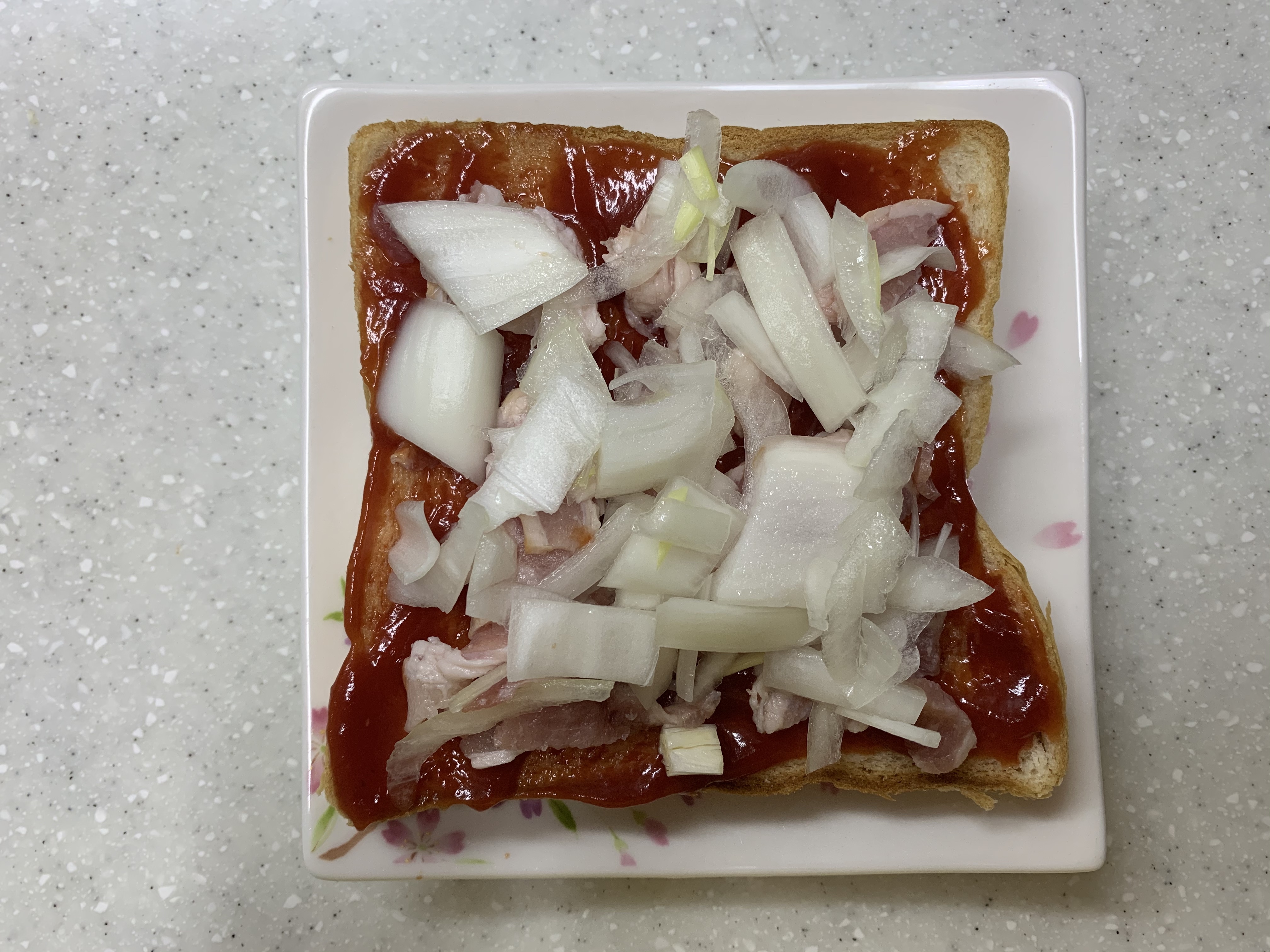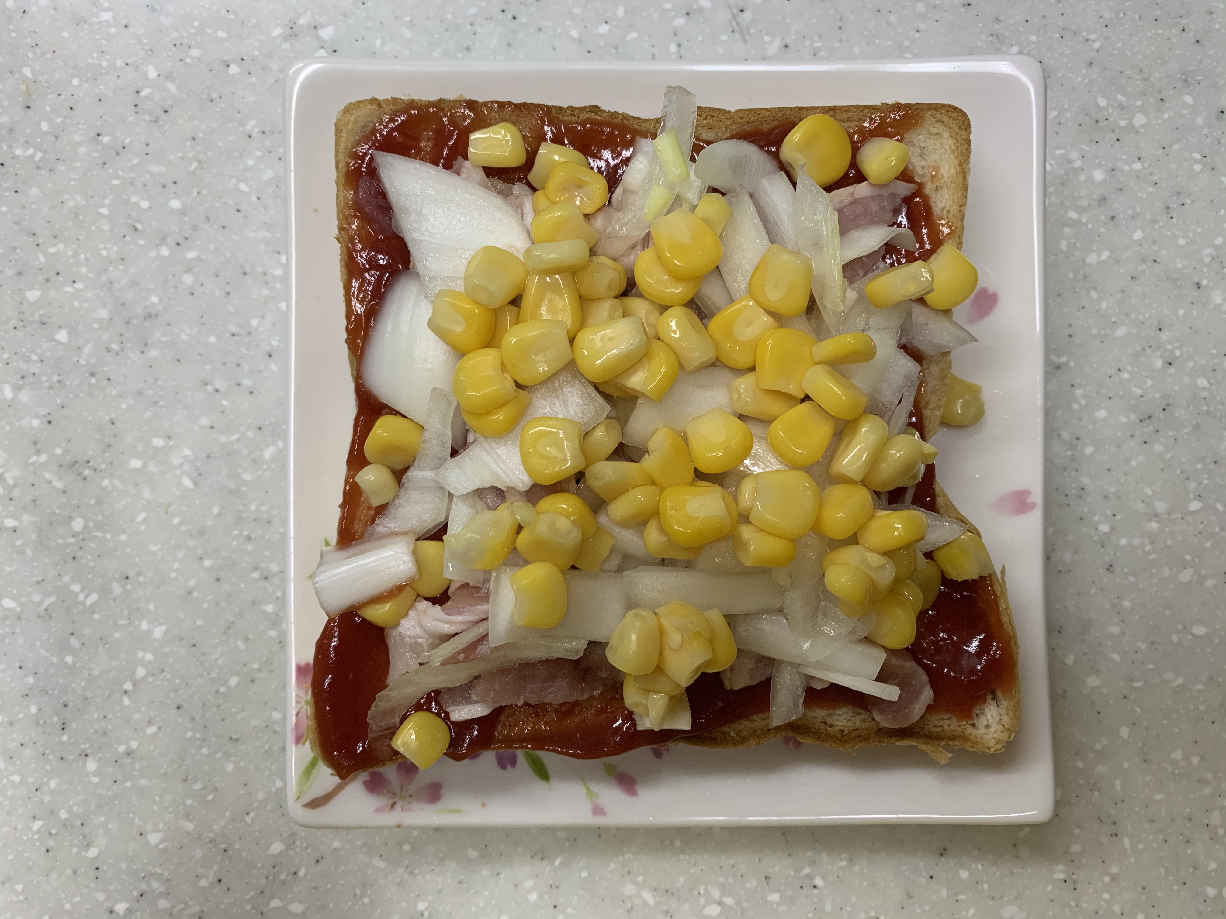 냉장고 파먹기를 해요!재료: 식빵, 케챱, 양파, 캔옥수수, 베이컨, 모짜렐라치즈