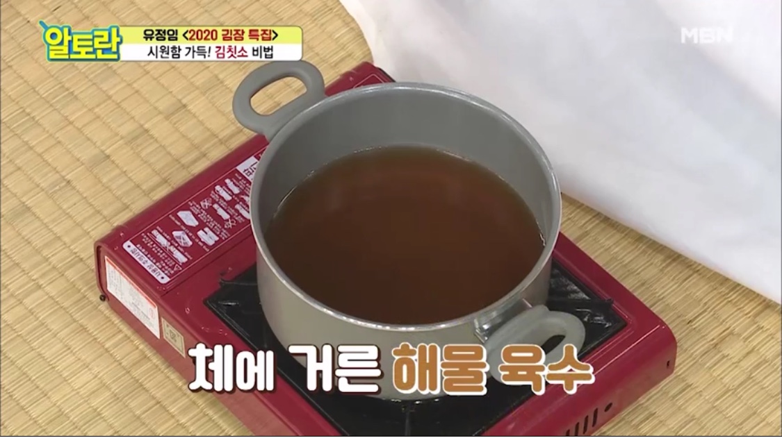 텁텁하지 않고 깔끔한 맛이 나요.6. 재료를 체에 걸러 육수를 준비해놓는다.