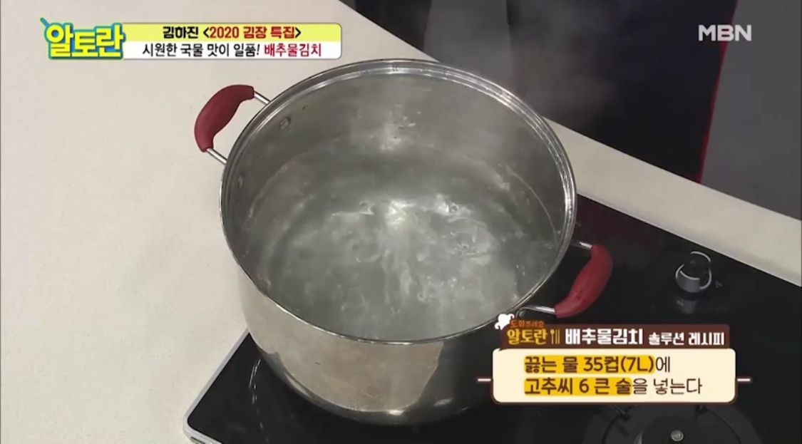 김칫국물의 청량감이 한층 더 업 된답니다.1. 끓는 물 35컵(7L)에 고추씨 6큰술을 넣는다.