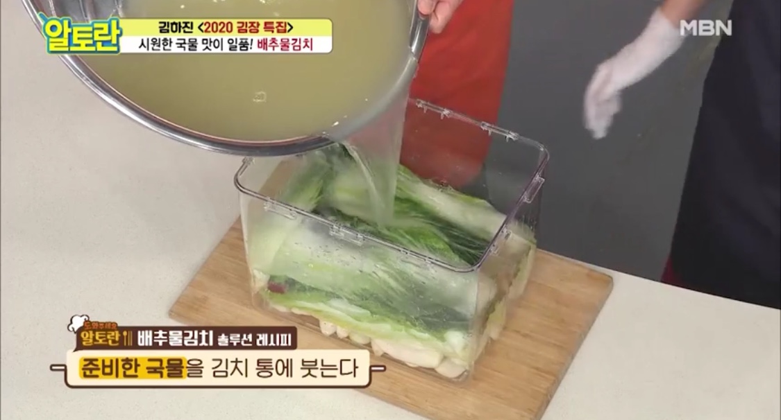 사용한 소금물을 부어주세요.5. 배추 상태에 따라 6~8시간을 절인다.