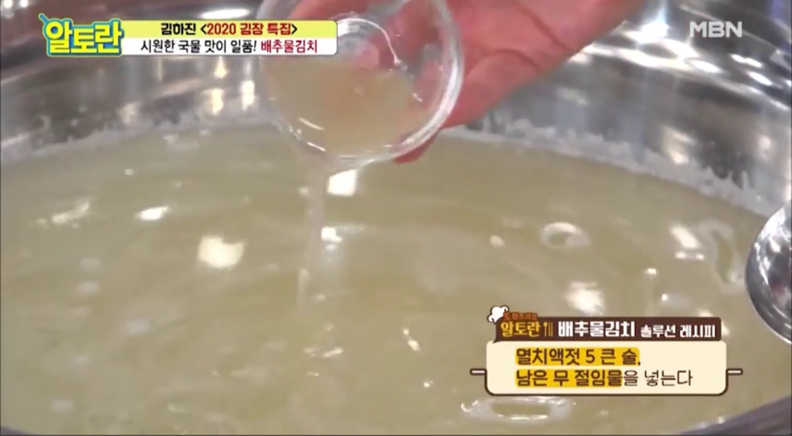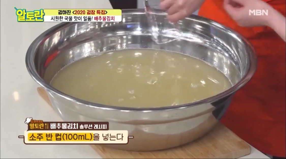 김칫국물의 간은 삼삼하게 맞춰야 해요.10. 소주 반 컵(100ml)을 넣는다.