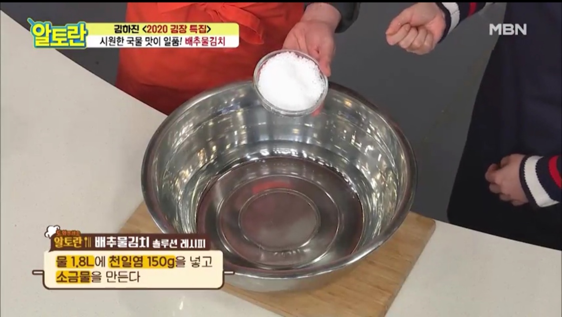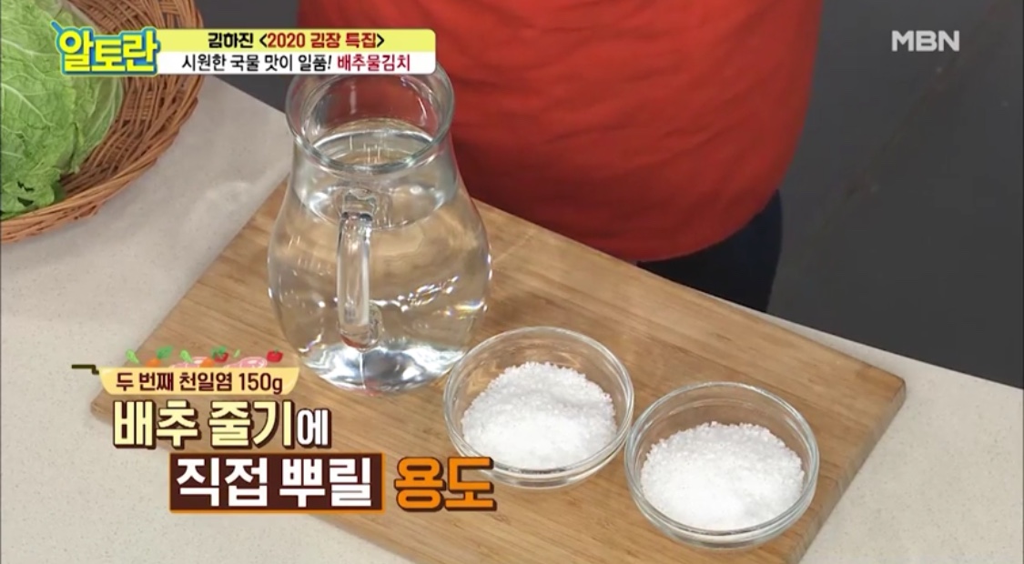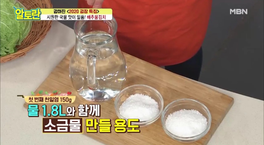 반은 배추 줄기에 직접 뿌리는 용도로 사용해요.1. 물 1.8L에 천일염 150g을 넣고