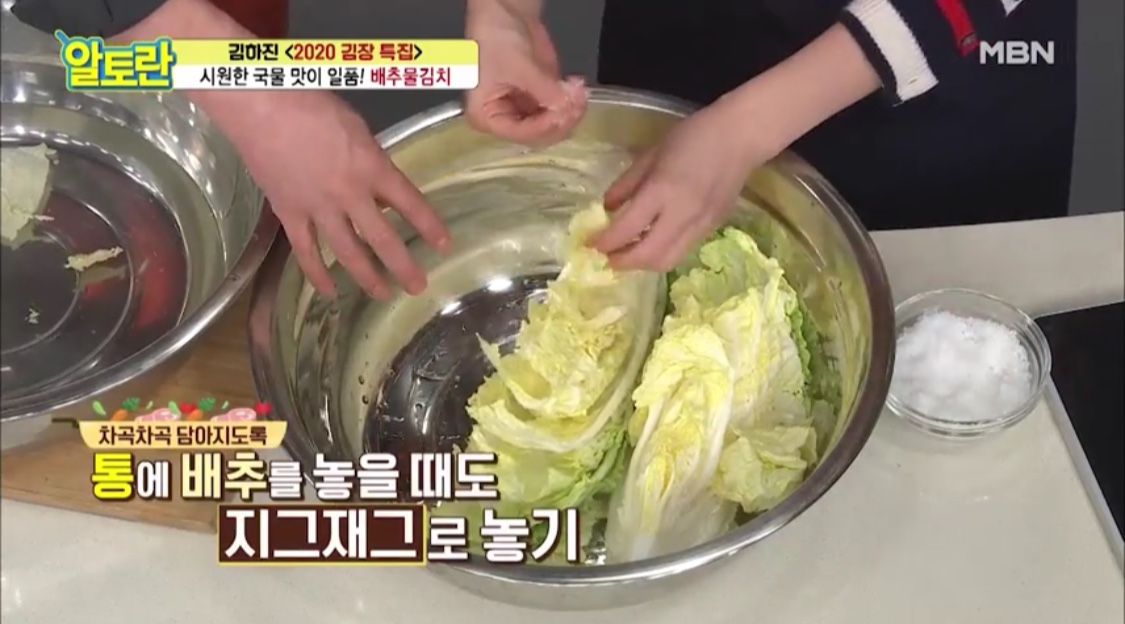 이파리와 절이는 시간이 동일해져요.4. 배추는 지그재그로 넣은 후