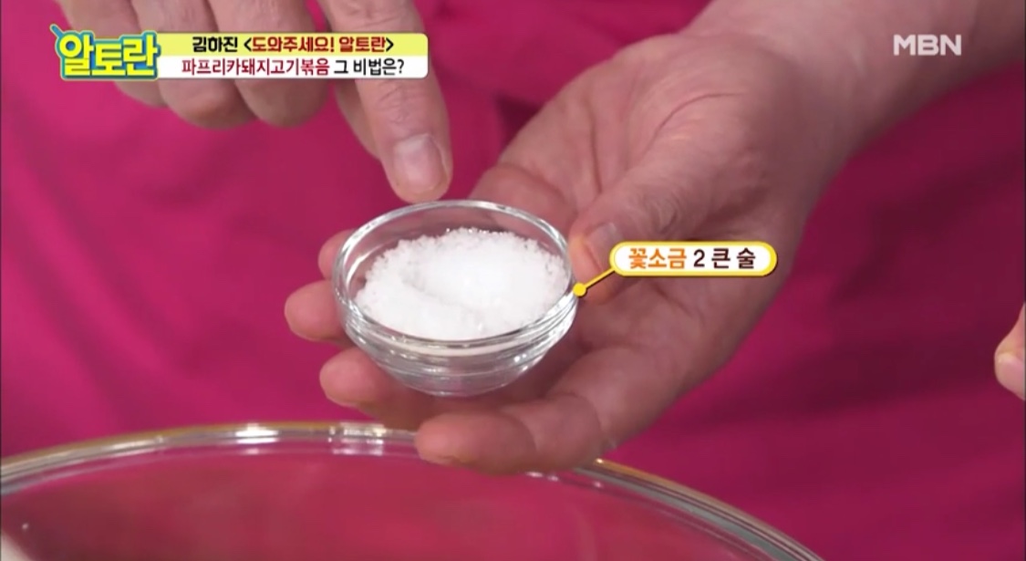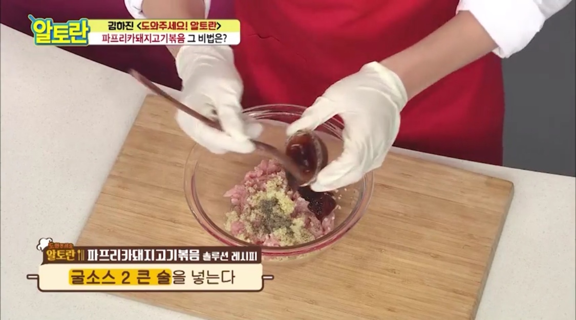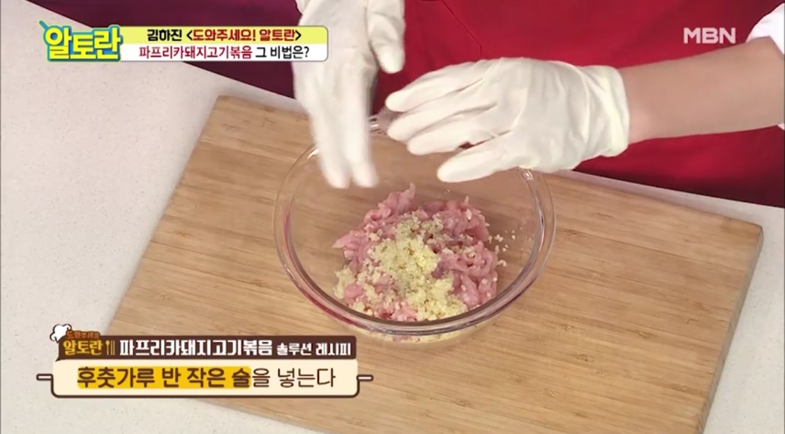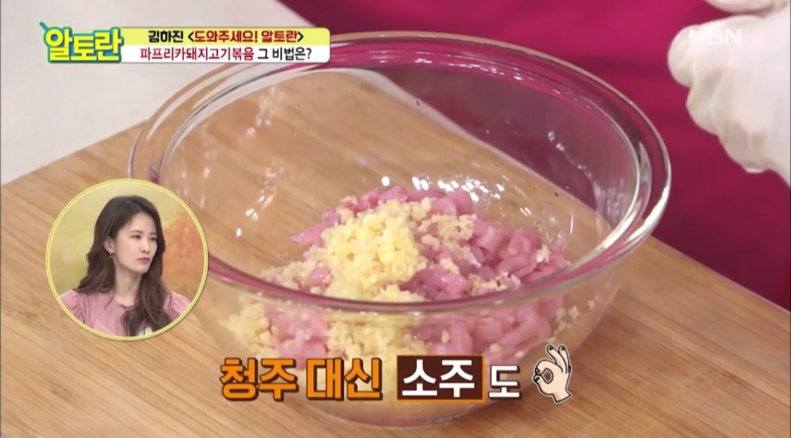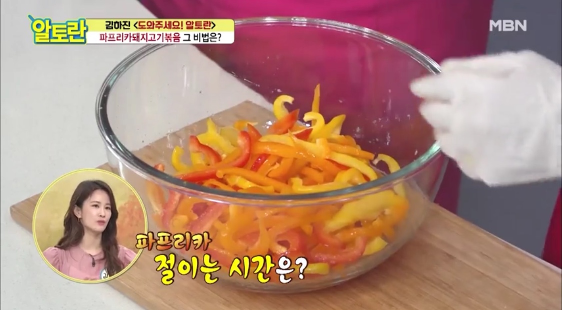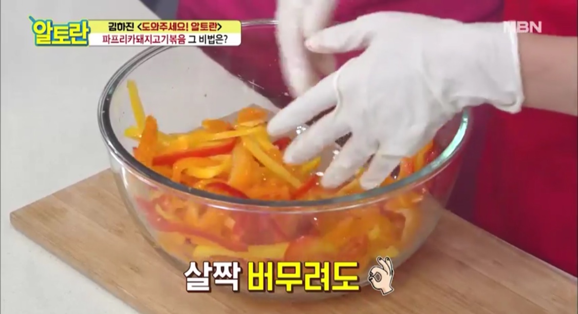 함께 알아봐요!재료: 돼지고기, 파프리카, 양파, 꽃소금, 다진마늘, 청주, 후춧가루, 생강즙, 굴소스, 식용유, 고추기름, 참기름, 깨소금