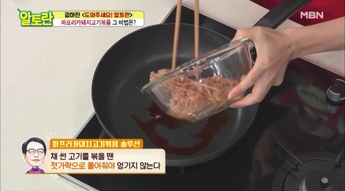 풀어줘야 엉기지 않아요.8. 밑간 한 돼지고기를 넣고 볶는다.
