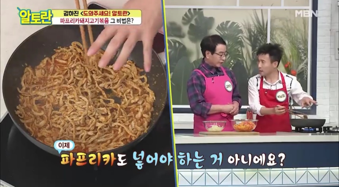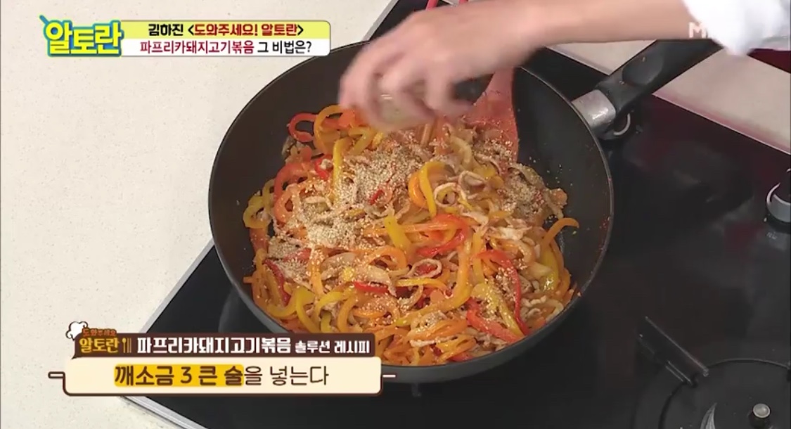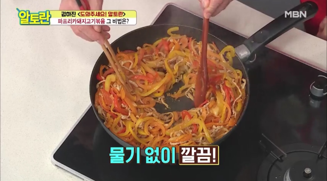 수분이 생기지 않고 고소한 풍미가 좋아요.수분이 사라지면 파프리카가 들어갈 차례예요.
