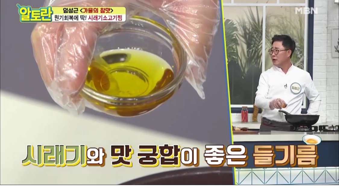 시래기와 맛 궁합이 좋은 들기름!!3. 들기름 3큰술을 넣는다.