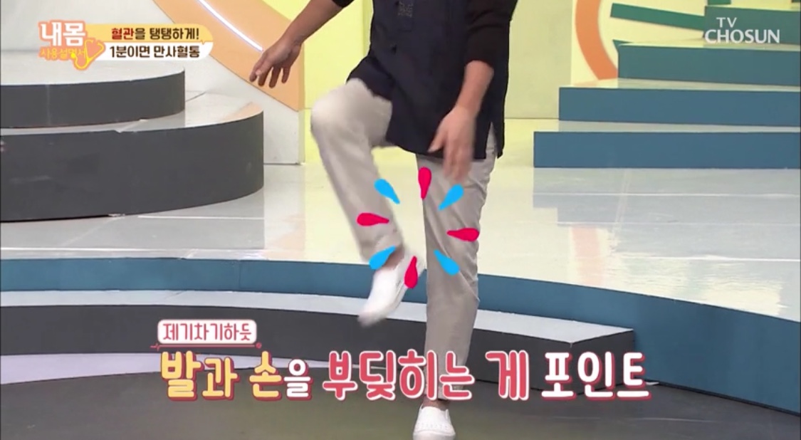 Tip. 발과 손을 부딪히는 게 포인트에요.