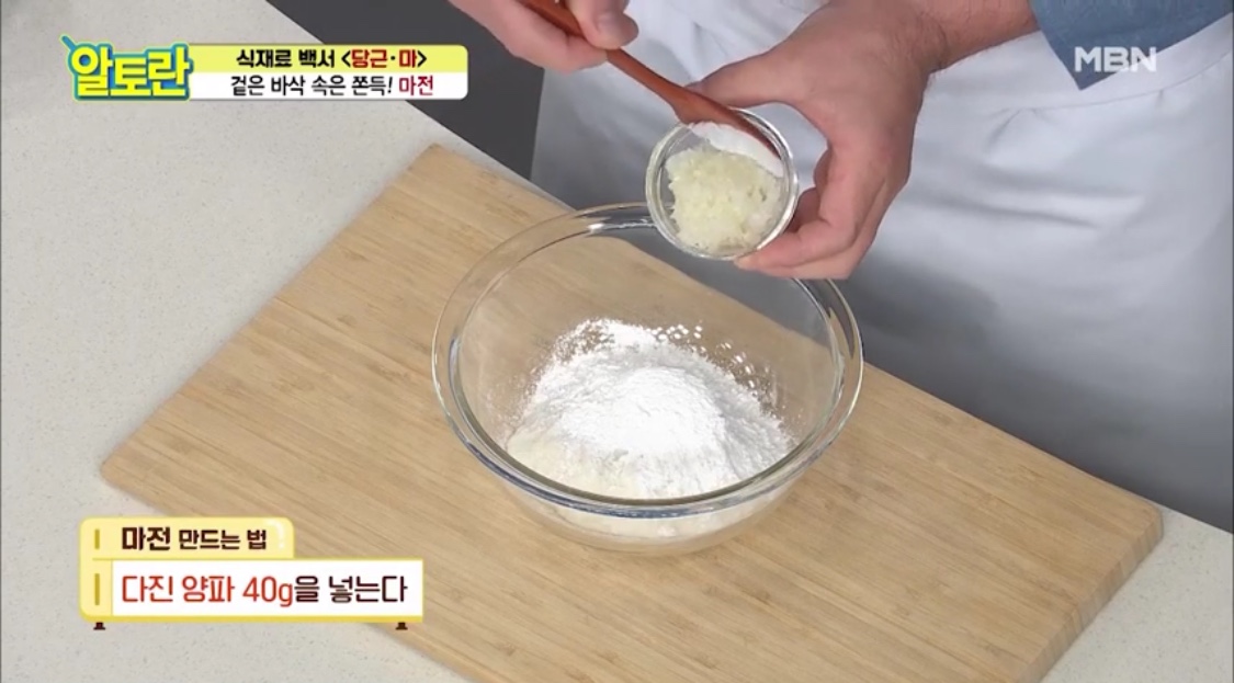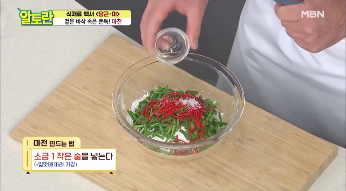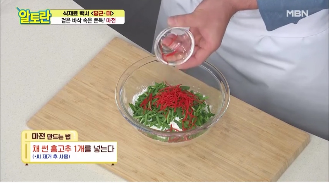 재료: 산마, 찹쌀가루, 다진 양파, 부추, 홍고추, 소금