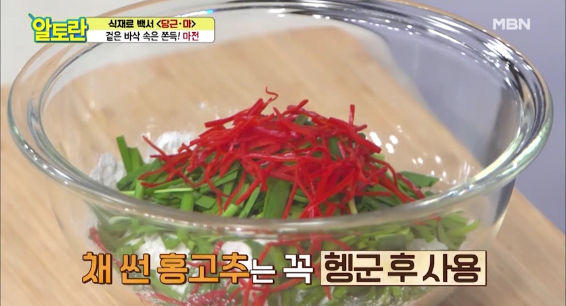 찹쌀가루를 넣는 게 좋아요.다음은 식감을 더할 채소 3형제 등장!