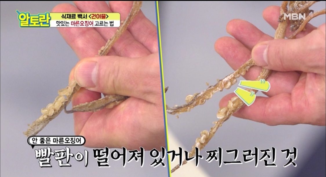 끝까지 붙어 있는 것이 좋아요.안 좋은 마른오징어는