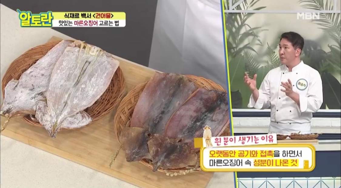 첫 번째. 흰 분이 적은 것을 골라라!흰 분이 적은 오징어가 더 비싸요.
