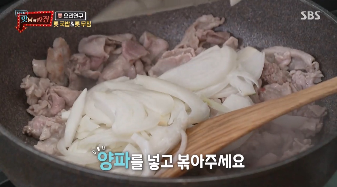 채 썬 양파를 넣고 볶는다.3. 데친 생 톳을 먹기 좋게 잘라 넣는다.