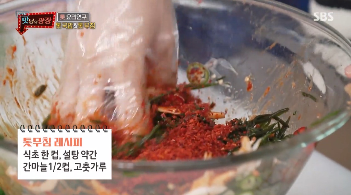 간마늘 반컵, 고춧가루를 넣는다.3. 양념이 잘 스며들도록 팍팍 무친다.