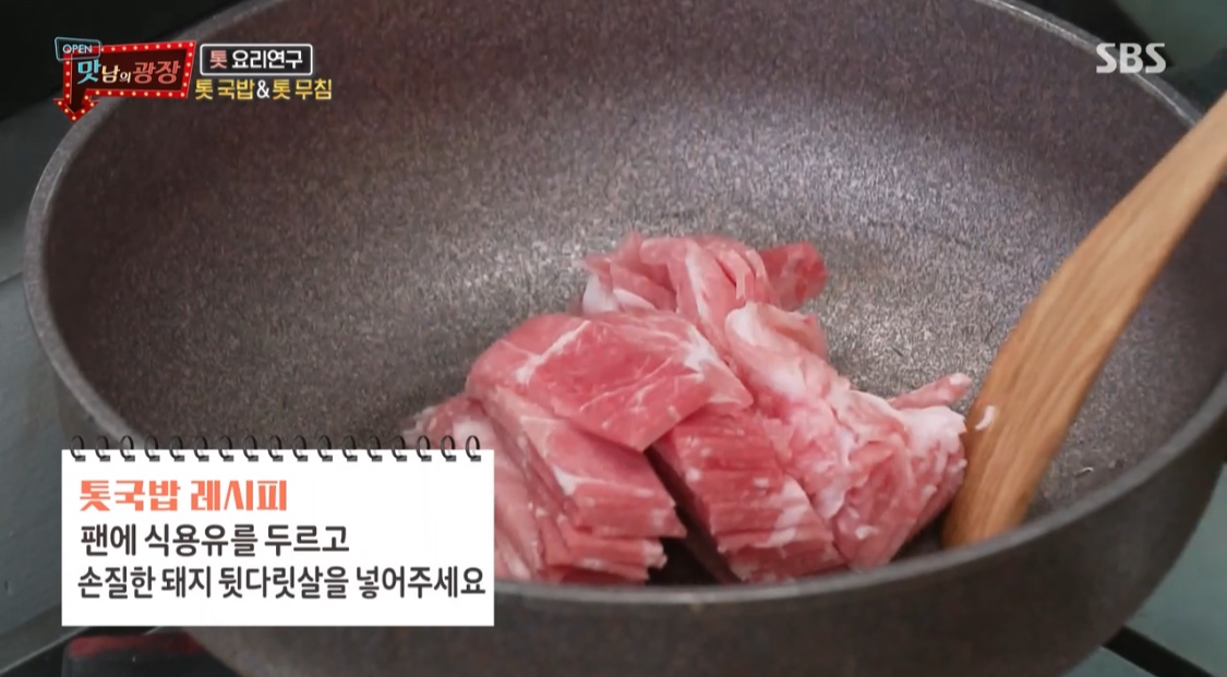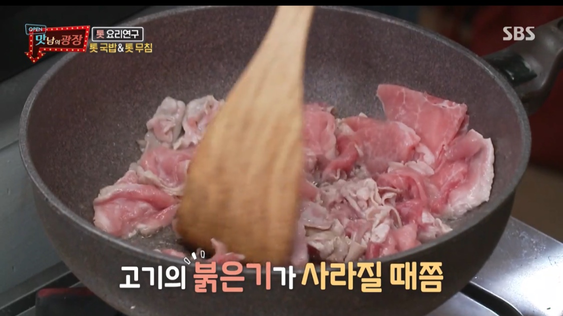 돼지 뒷다릿살을 넣는다.2. 고기의 붉은기가 사라질 때쯤