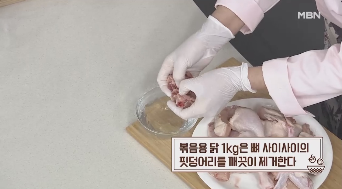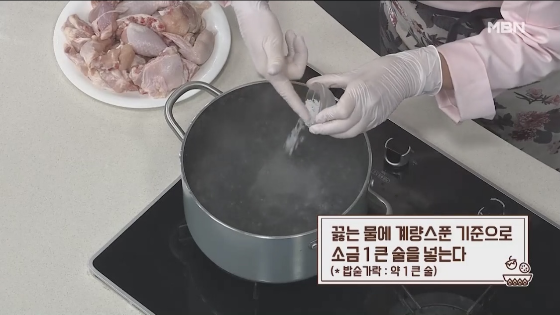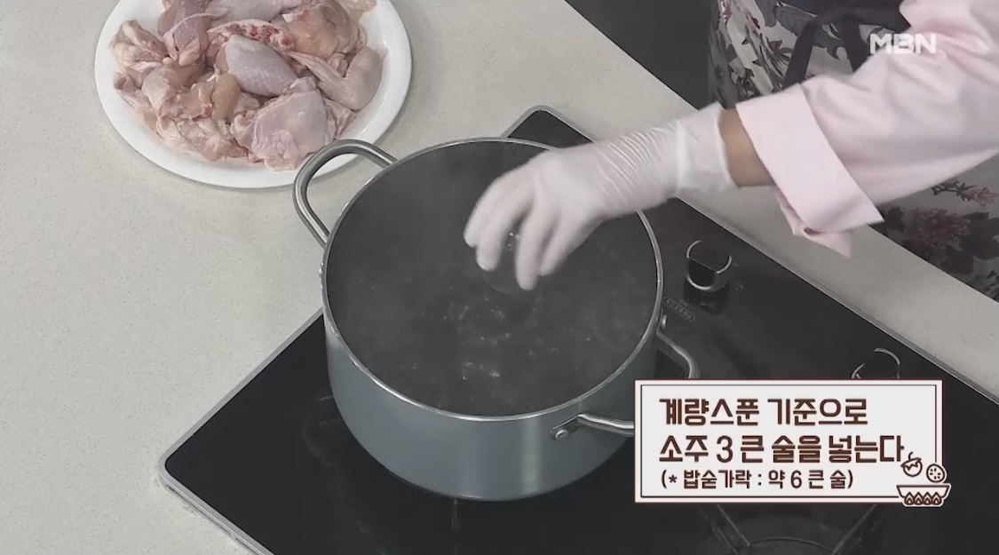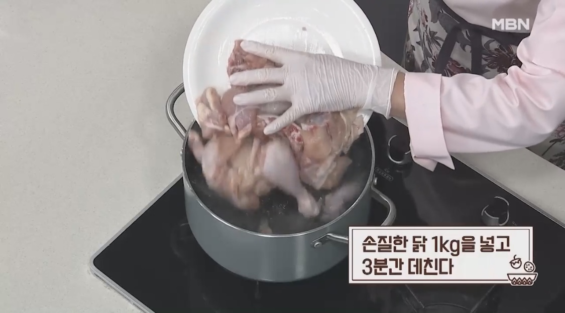 소주: 밥숟가락 6큰술)3. 손질한 닭 1kg을 3분간 데치고