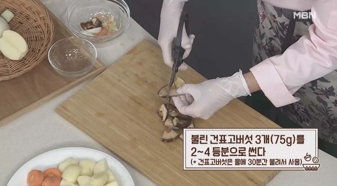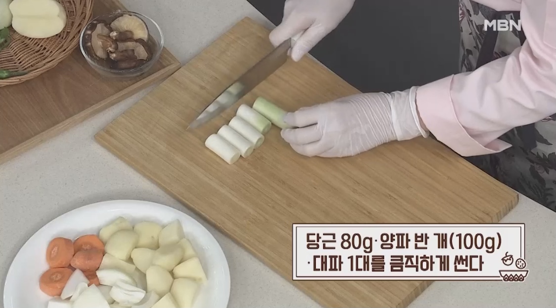 대파 1대를 큼직하게 썬다.6. 불린 건표고버섯 3개 (75g)를