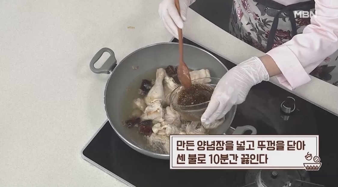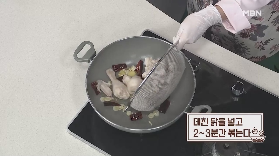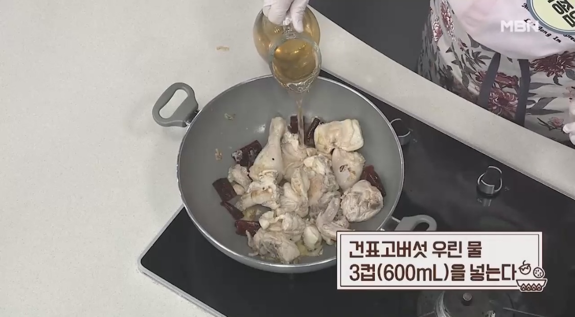 데친 닭을 넣고 2~3분간 볶는다.14. 건표고버섯 우린 물 3컵(600ml)에
