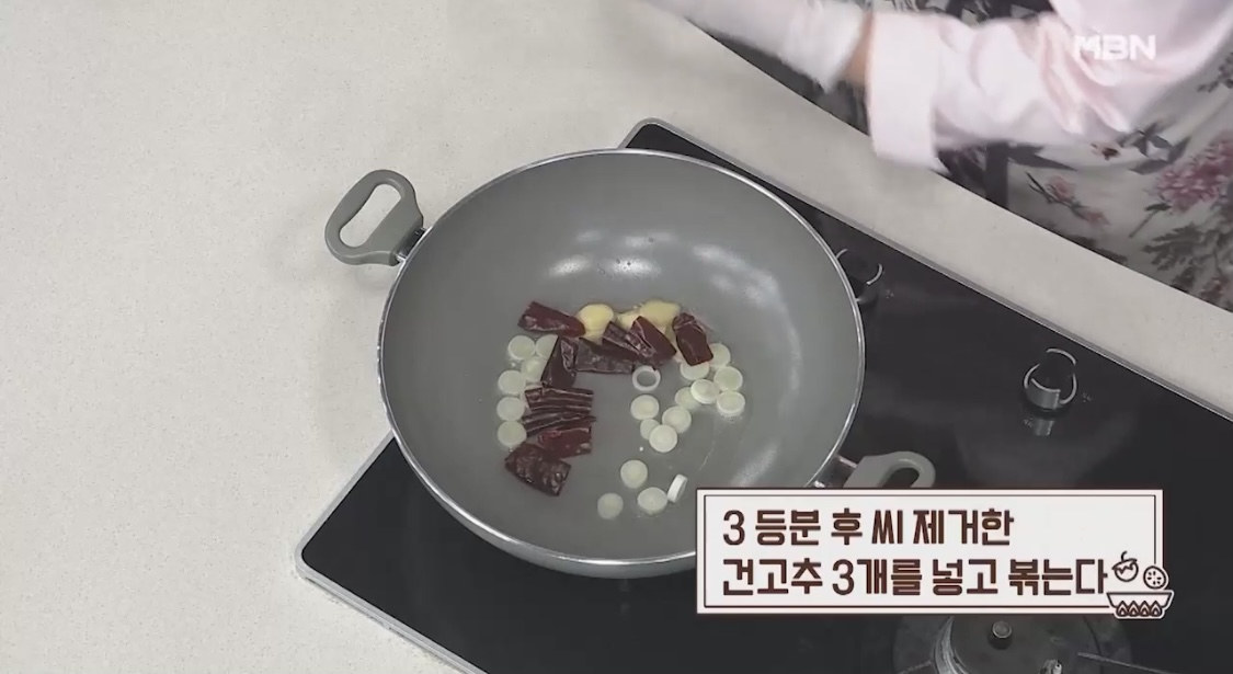 송송 썬 대파 흰 줄기 반대를 넣는다.13. 3등분 후 씨를 제거한 건고추 3개와
