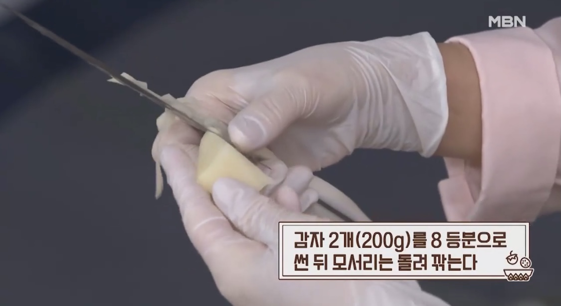 체에 받쳐 물기를 제거한다.4. 감자 2개 (200g)를 8등분으로 썬 뒤