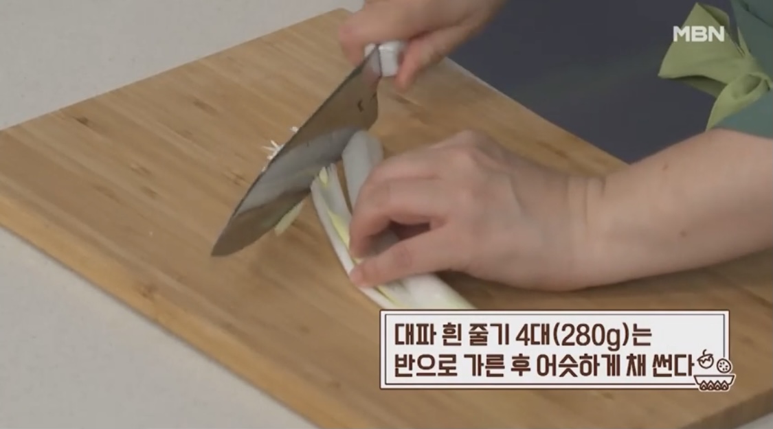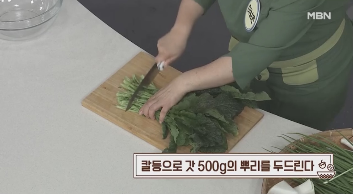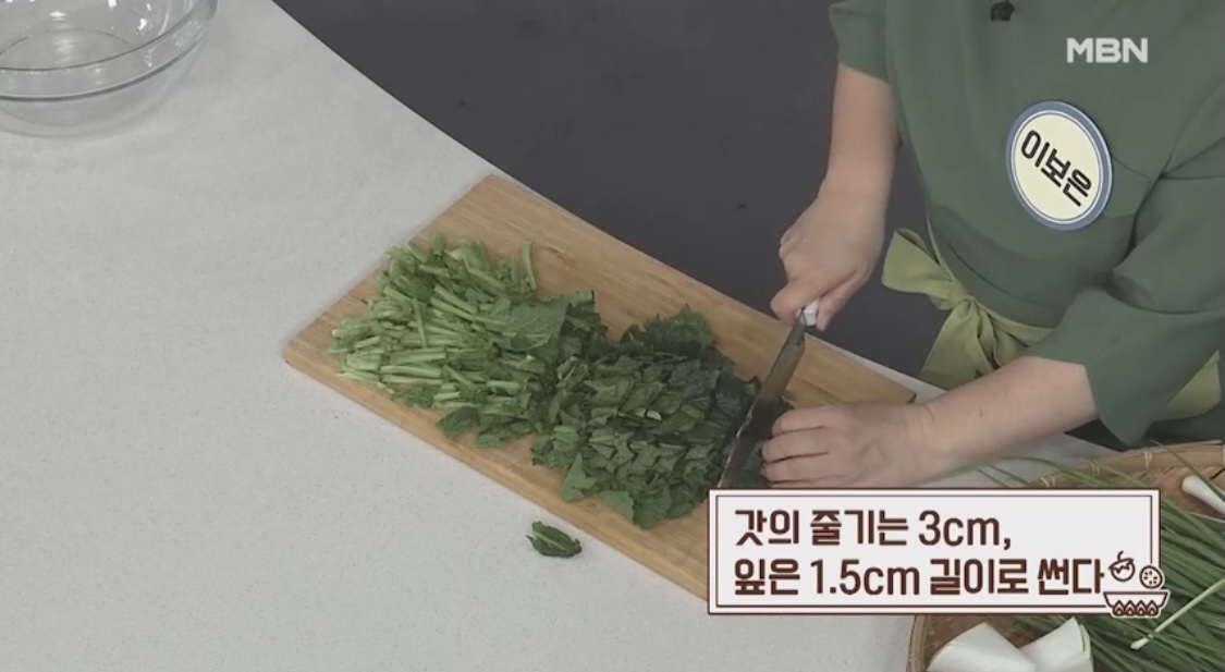갓의 줄기는 3cm, 잎은 1.5cm 길이로 썬다.7. 쪽파 500g은 2cm 길이로 썰고,