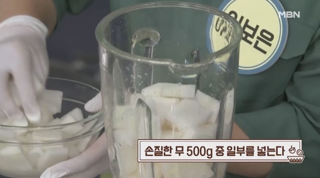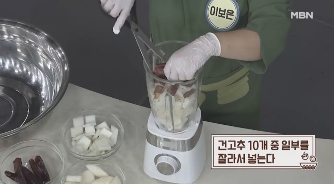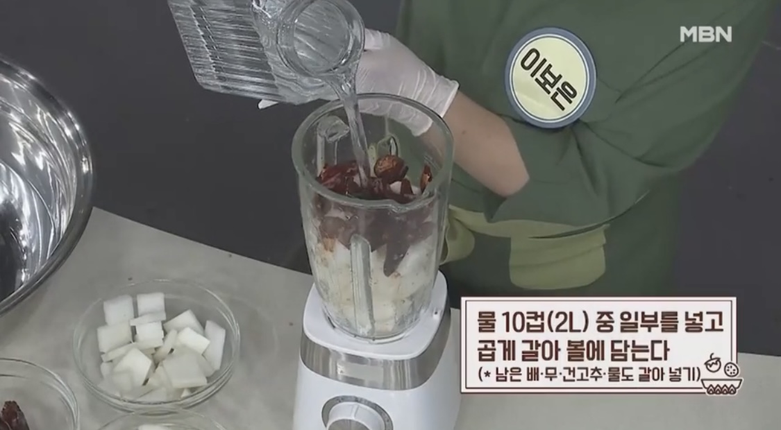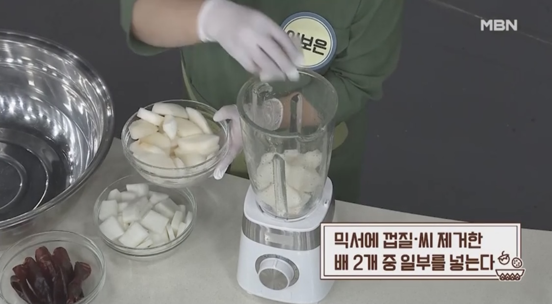 (* 풀국은 차게 식혀서 사용)10. 믹서에 껍질과 씨를 제거한 배 2개,