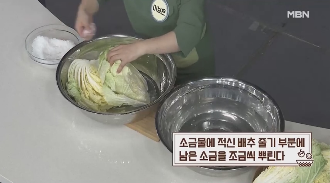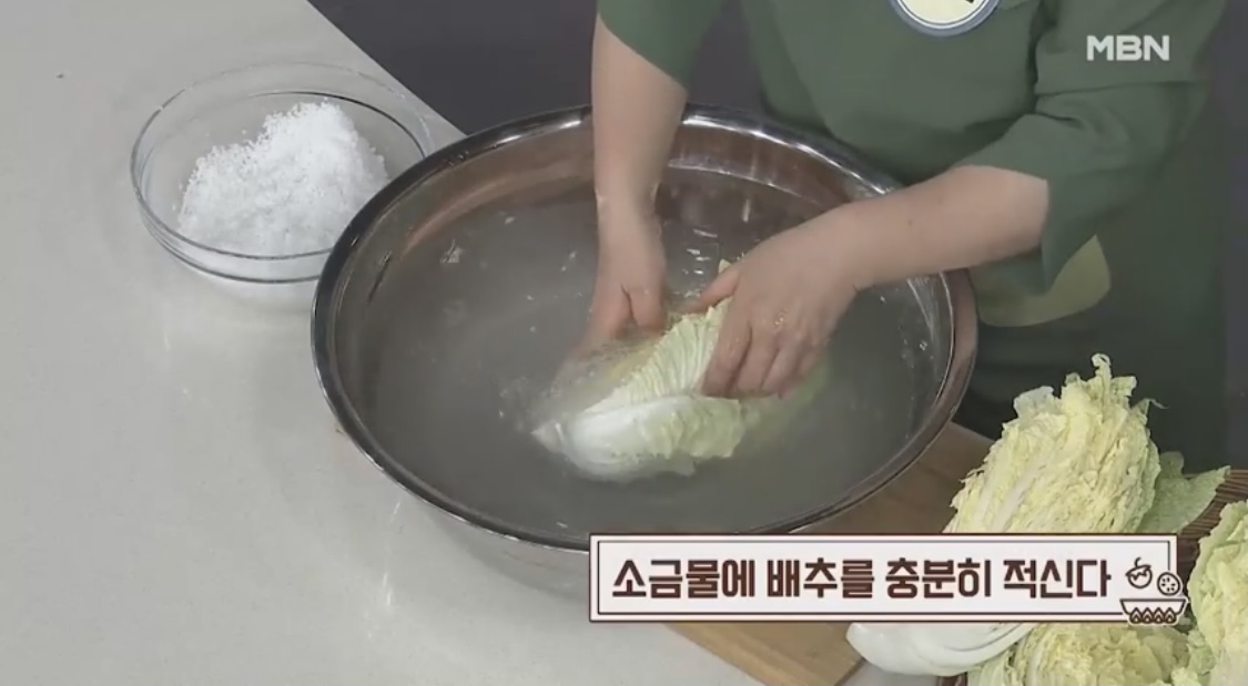 소금물에 배추를 충분히 적신다.3. 소금물에 적신 배추 줄기 부분에