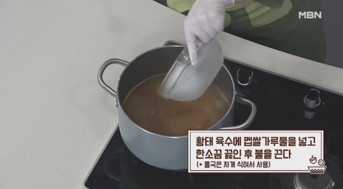 황태 육수에 넣어 한소끔 끓인 후 불을 끈다.