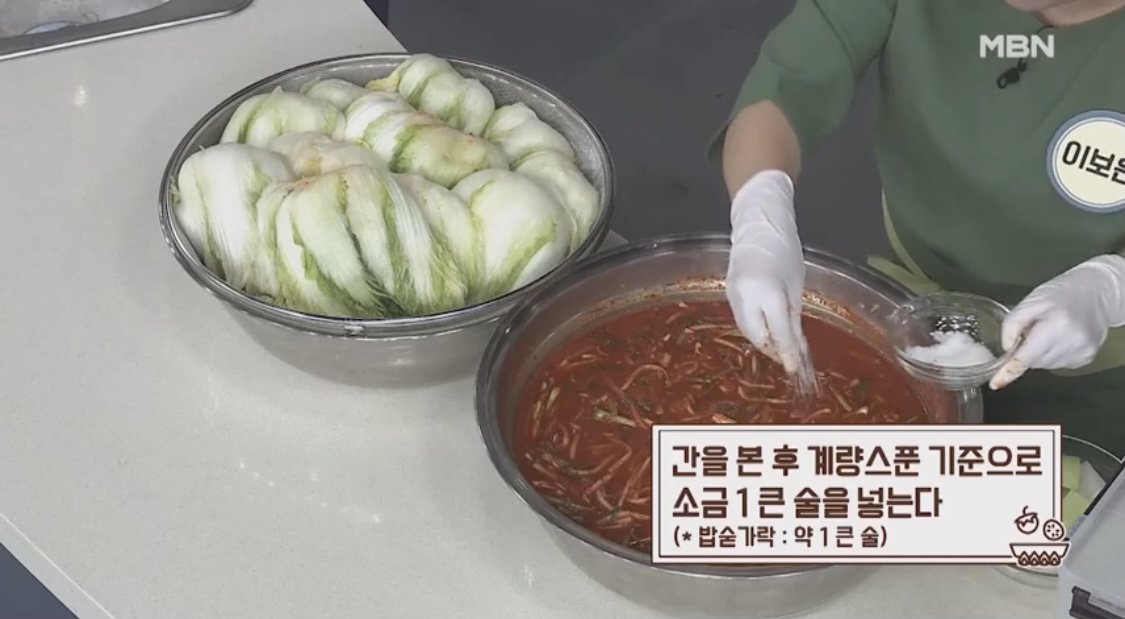 계량스푼 기준으로 소금 3큰술을 넣는다.14. 손질한 무채와 갓, 쪽파,