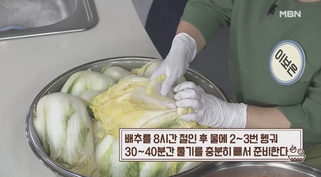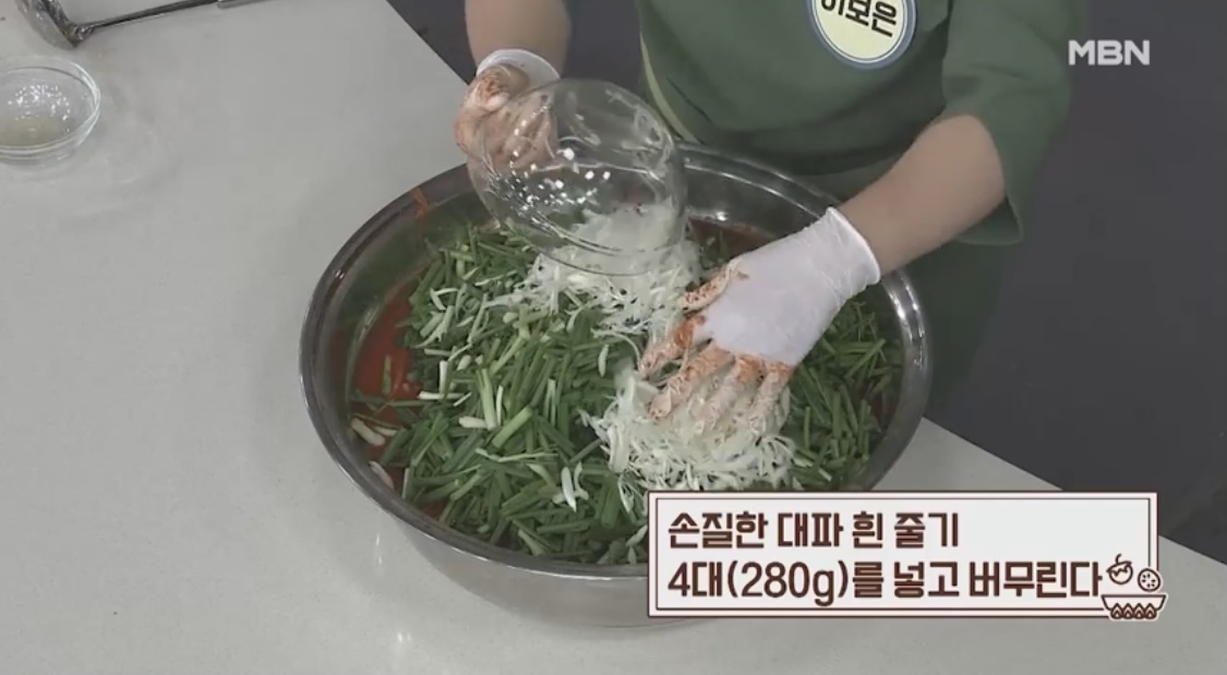 대파를 넣고 버무린다.15. 배추를 8시간 절인 후 물에 2~3번 헹궈