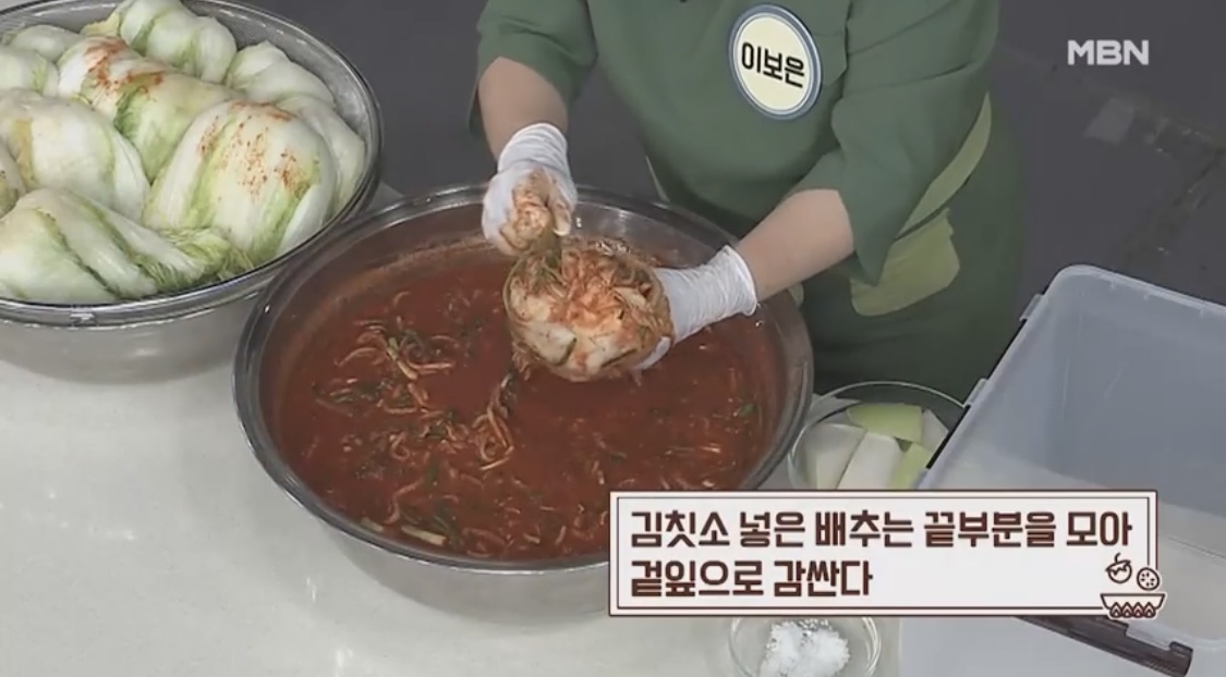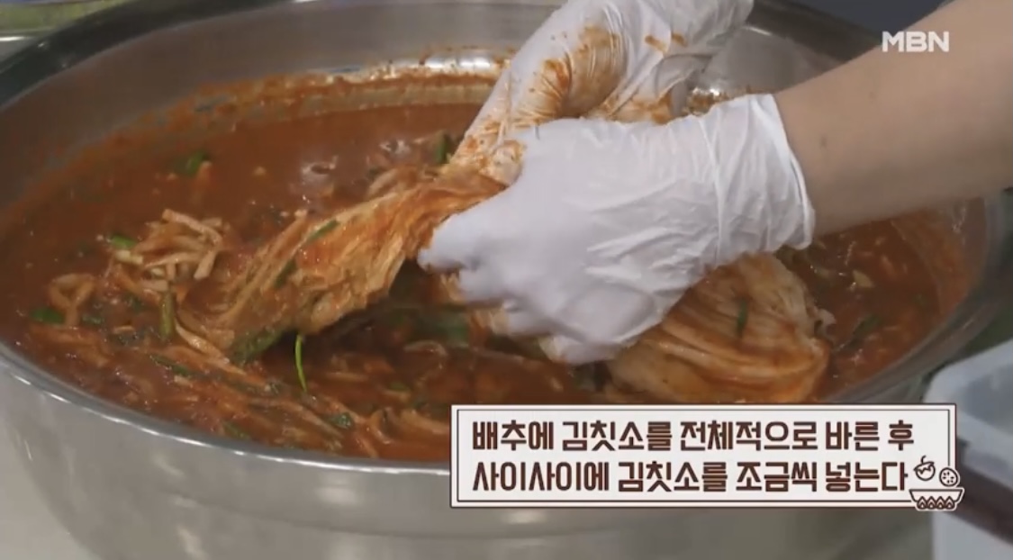 사이사이에 김칫소를 조금씩 넣는다.17. 김칫소 넣은 배추는 끝부분을 모아