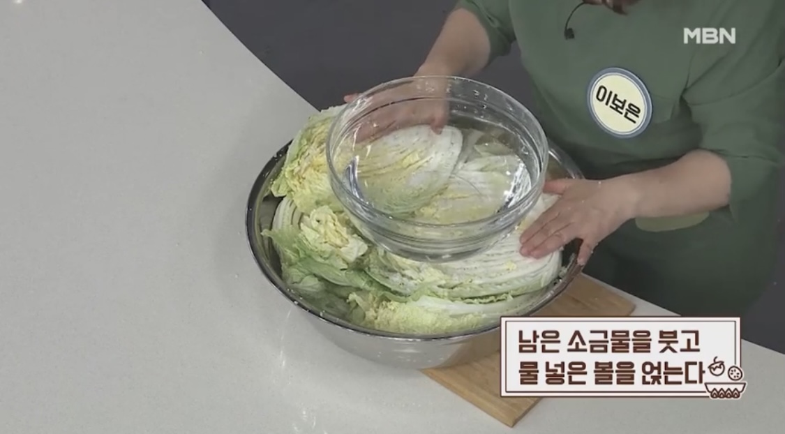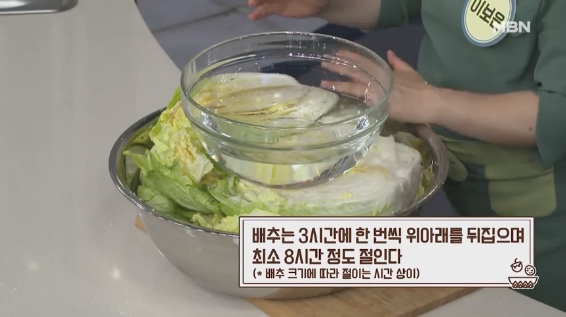 남은 소금물을 부어 물 넣은 볼을 얹는다.4. 배추는 3시간에 한 번씩