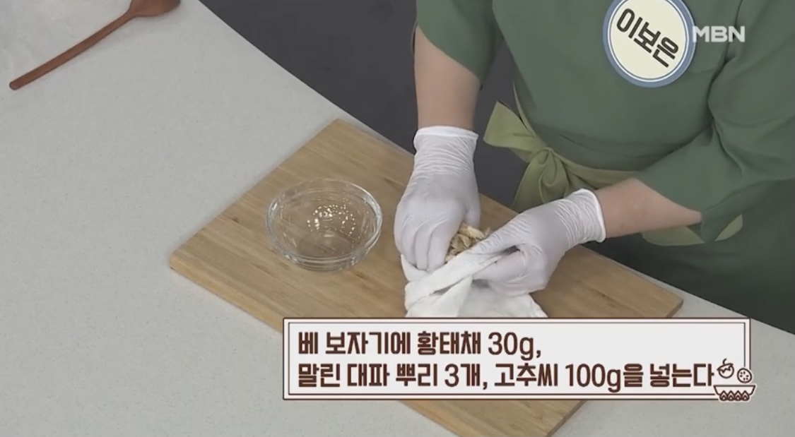 반으로 가른 후 어슷하게 채 썬다.8. 베 보자기에 황태채 30g,