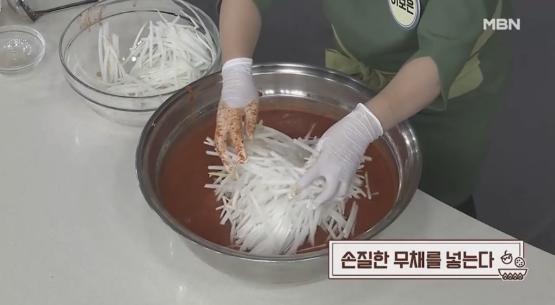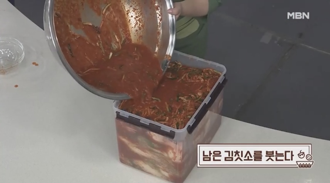 양념한 무 덩어리를 배추 사이사이에 넣는다.18. 남은 김칫소를 붓고