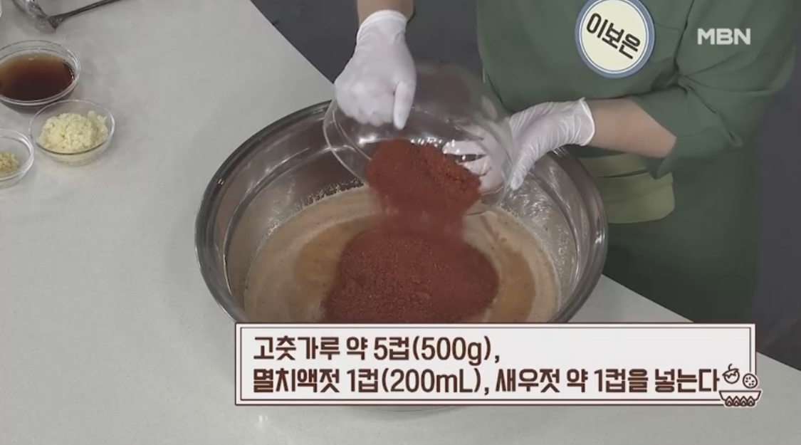 새우젓 약 1컵을 넣는다.12. 계량스푼 기준으로 다진 마늘 5큰술,