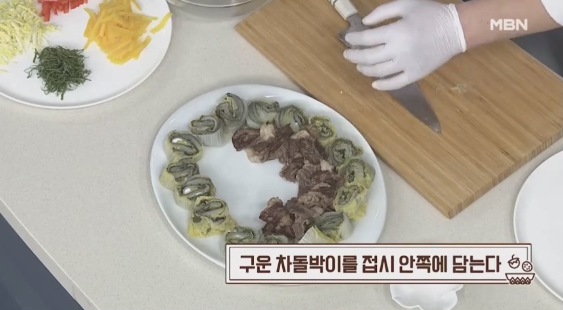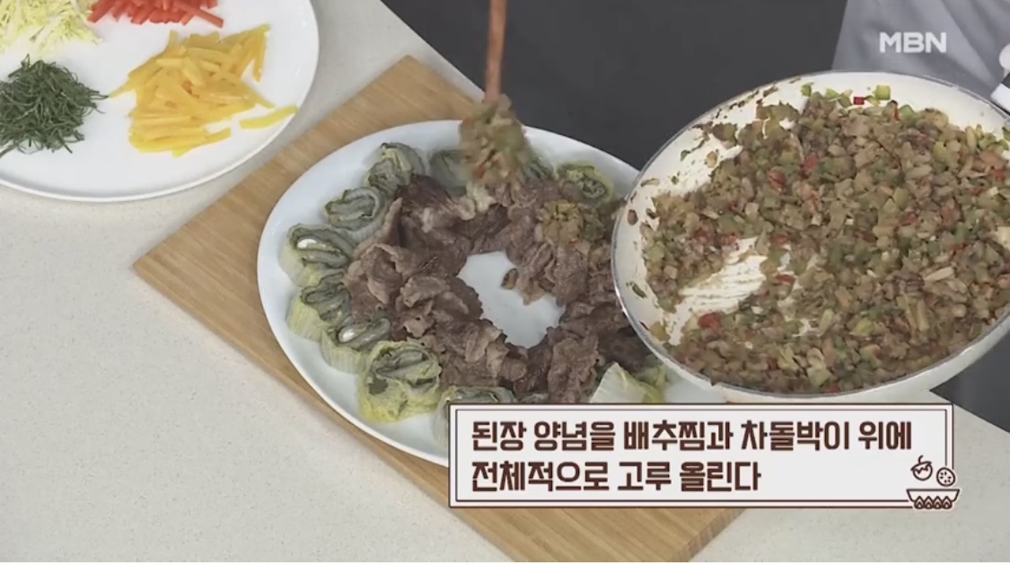 차돌박이는 접시 안쪽에 담는다.14. 된장양념을 고루 올리고