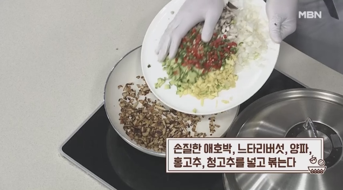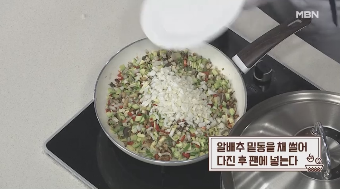 양파, 고추를 넣고 볶는다.9. 양배추 밑동을 채 썰어 다져 팬에 넣고