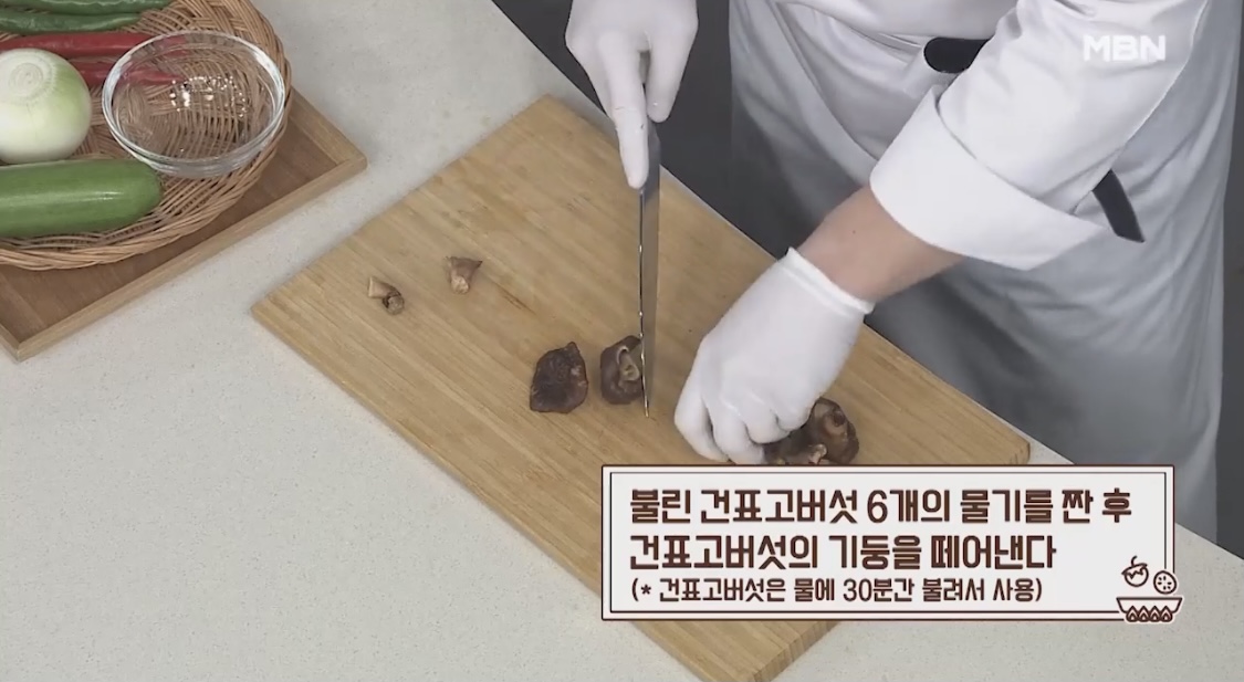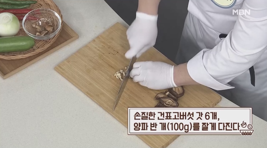 불린 물은 나중에 사용해요.7. 표고버섯 갓 6개, 양파 반개,