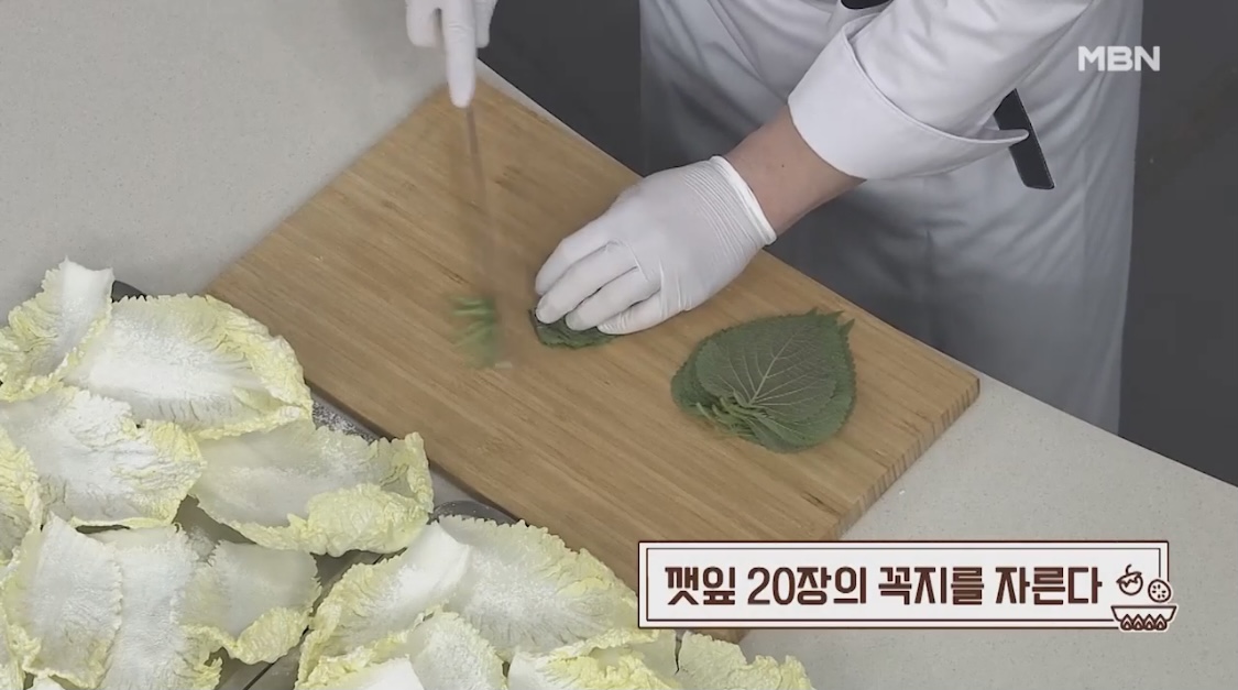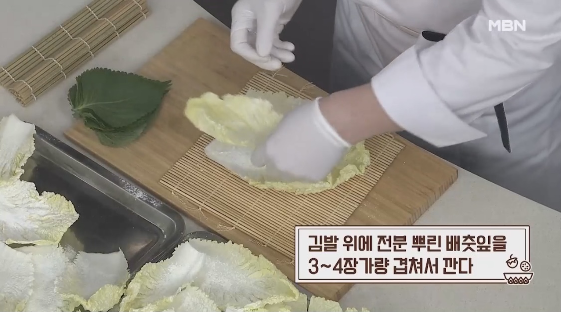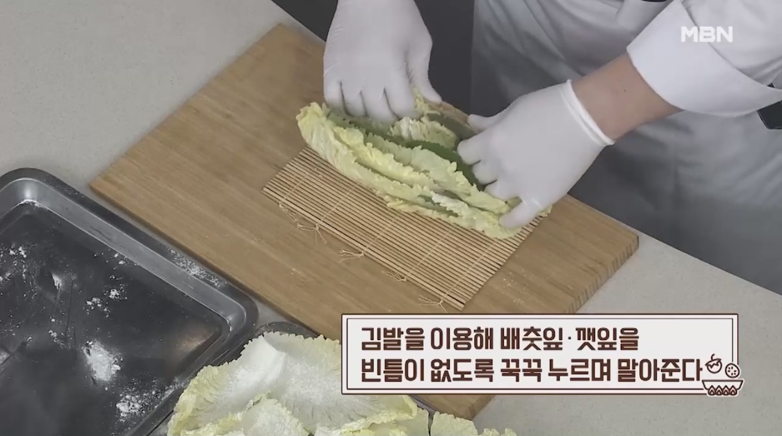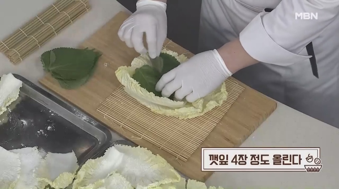 깻잎은 꼭지를 자른다.3. 김발 위에 배춧잎 3~4장을 겹쳐깔고