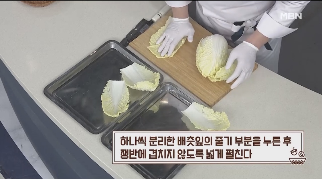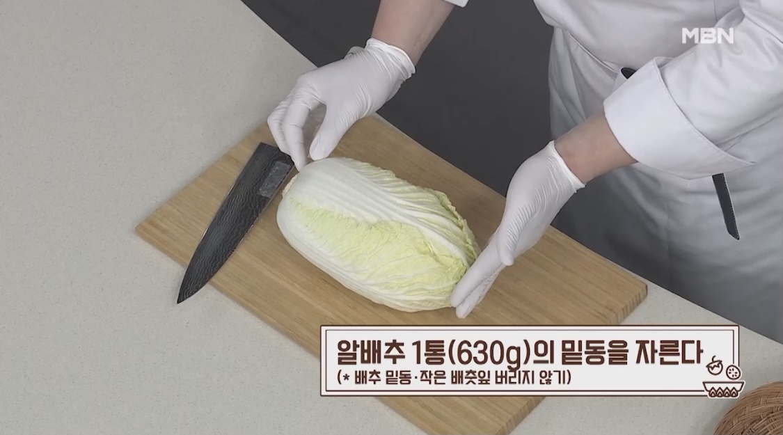 1. 알배추 1통의 밑동을 잘라 한장씩 분리해