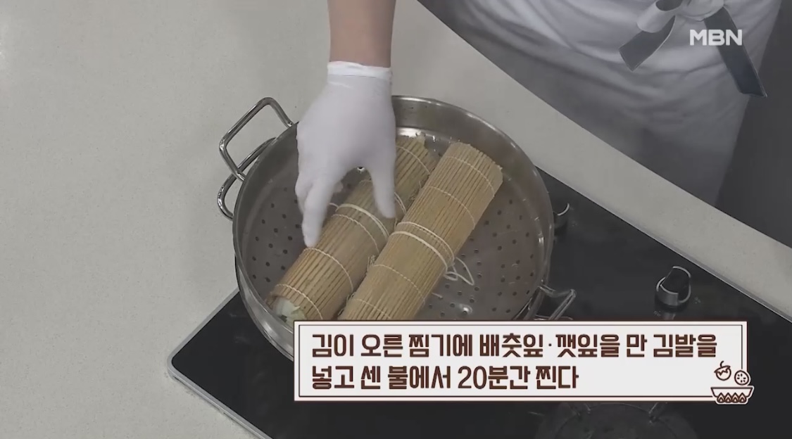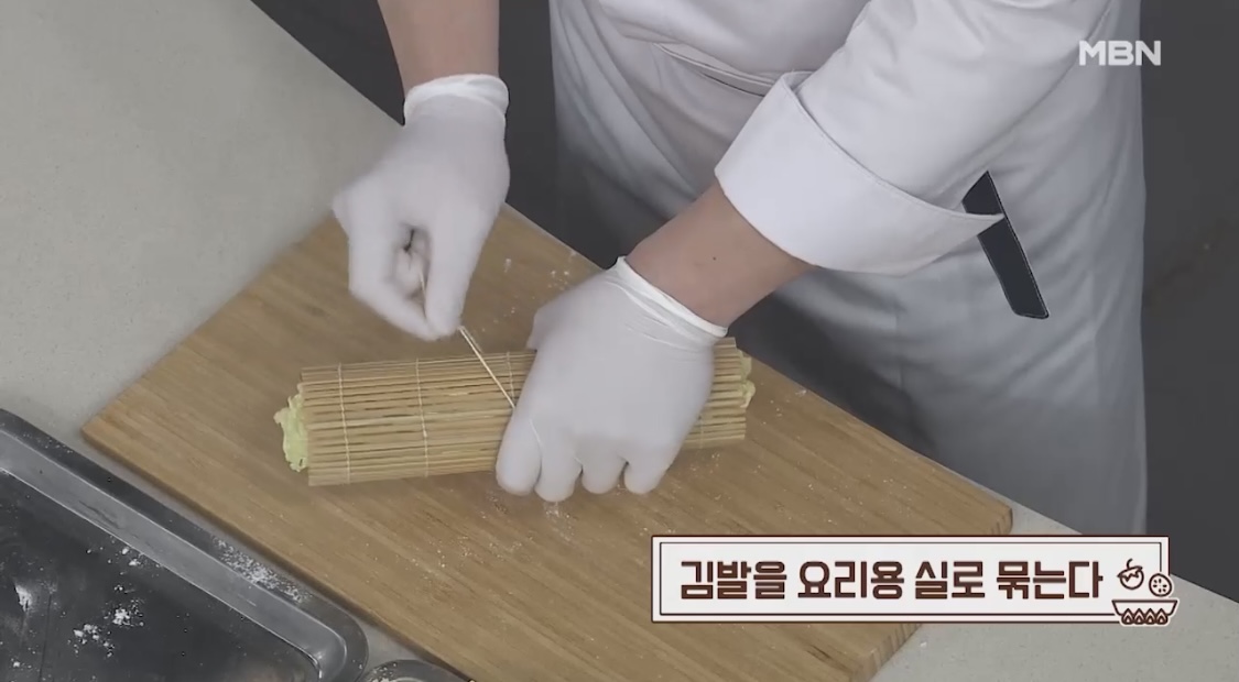 꾹꾹 누르며 만 후, 요리용 실로 묶는다.5. 김이 오른 찜기에 김발을 넣고