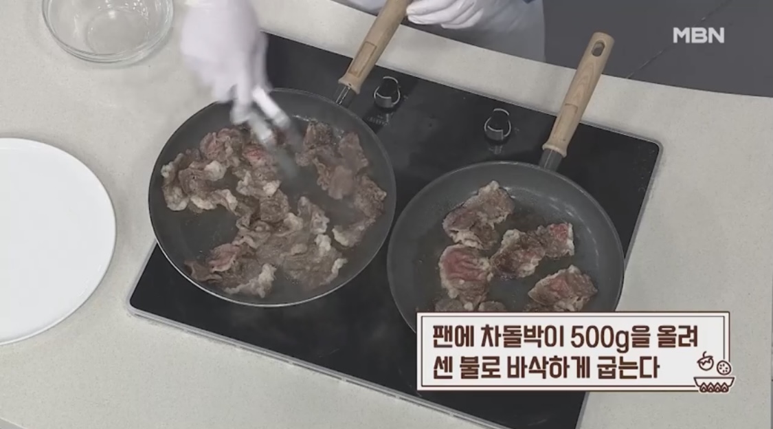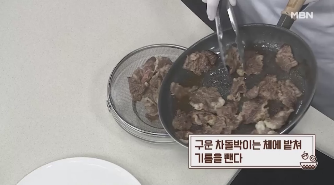 얼음물에는 약 10분간 담가 식혀요.12. 차돌박이를 센 불로 바삭하게 굽고