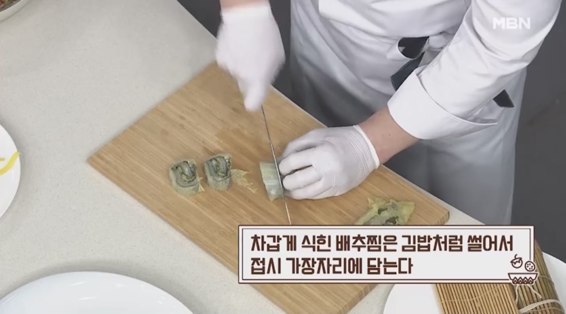 체에 밭쳐 기름을 뺀다.13. 차갑게 식힌 배추찜은 김밥처럼 썰고