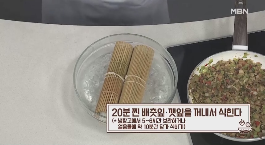 불을 바로 끄고 섞어준다.11. 20분 찐 배춧잎, 깻잎을 꺼내 식힌다.
