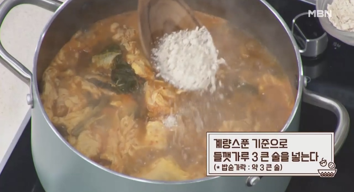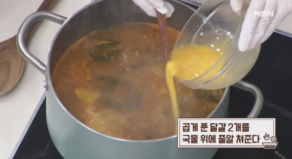 곱게 푼 달걀 2개를 국물 위에 줄알 쳐준다.10. 들깻가루 3큰술을 넣는다.