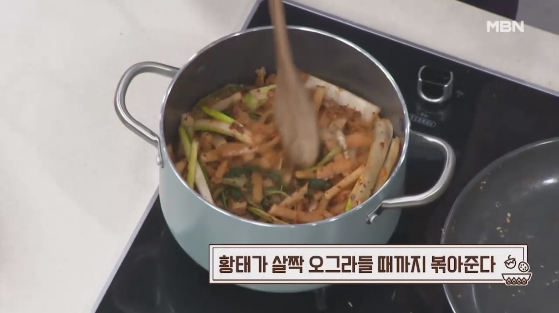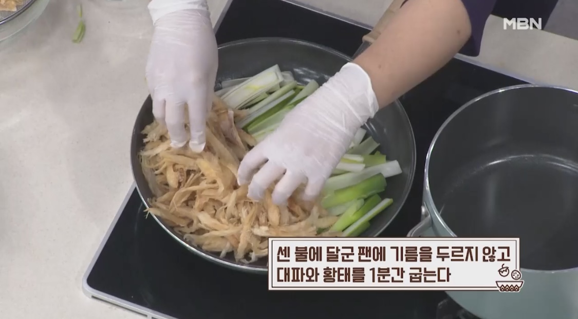 대파와 황태를 1분간 굽는다.6. 황태와 대파, 무, 우거지를 볼에 담고