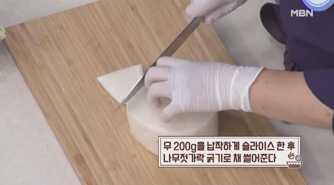 10~15cm 길이로 잘게 찢어준다.4. 무 200g을 납작하게 슬라이스 한 후