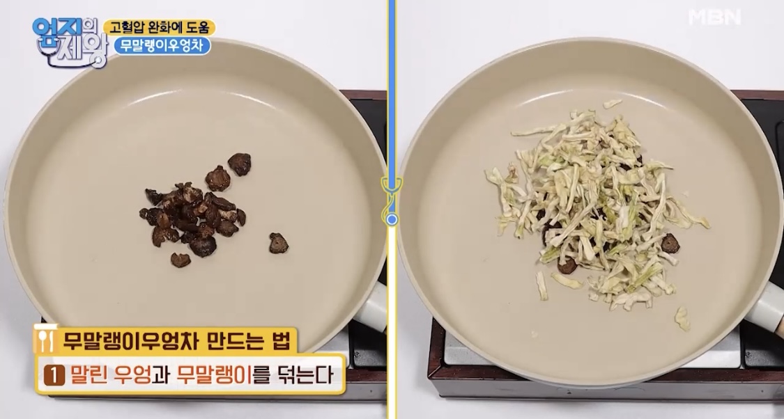 1. 말린 우엉과 무말랭이를 덖는다.