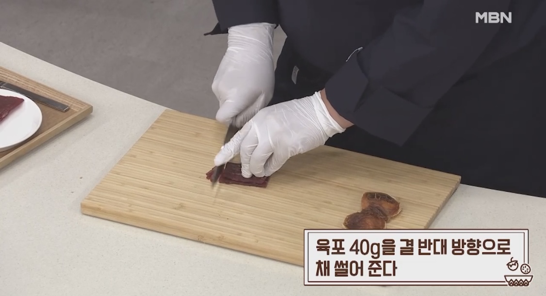 반으로 가르고, 씨는 제거한다.2. 육포 40g을 결 반대 방향으로 채 썰어준다.