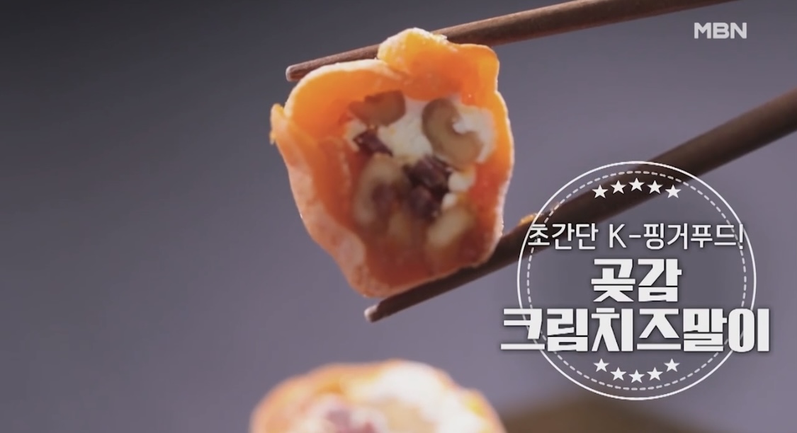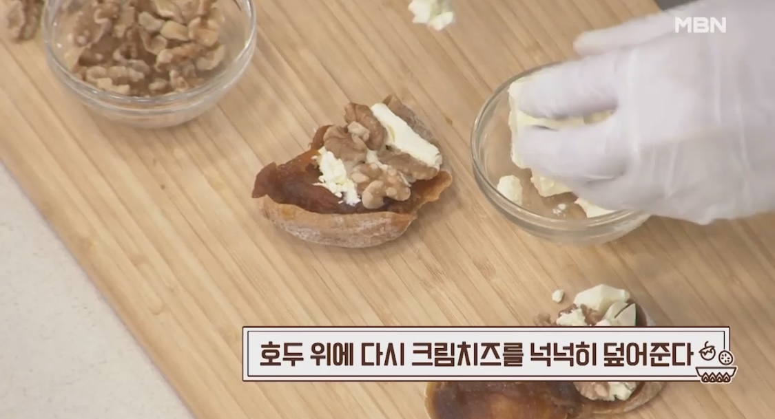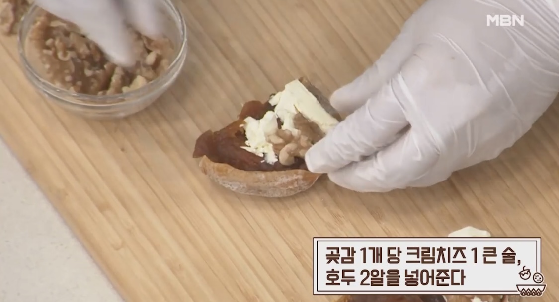3. 곶감 1개당 크림치즈 1큰술, 호두 2알을 넣고